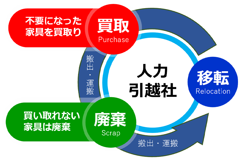 「買取り」で移転コストを抑え「リユース」でゴミを減らす。作業員・運搬費用が別々に掛からないから、個別の業者に依頼するよりもコストや手間・時間を大幅に削減できます。